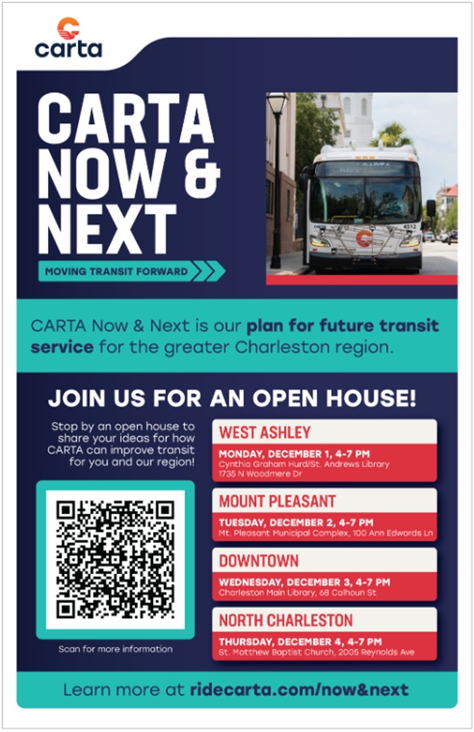 CARTA Now & Next is our agency’s plan for short- and long-term improvements to transit services throughout the greater Charleston area. It will provide CARTA and BCDCOG with updated direction to offer the best service possible for its riders, within the agency’s available resources.